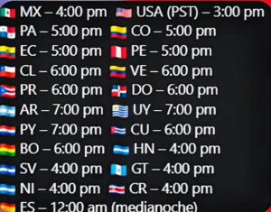 Para Colombia, el evento comenzará aproximadamente a las 2:00 PM hora local. Este mismo horario aplica para países como México, Perú, Ecuador y Centroamérica. En el caso de Chile comenzaría alrededor de las 3:00 PM, mientras que en Argentina sería aproximadamente a las 4:00 PM. Para España, el evento suele activarse cerca de las 9:00 PM.